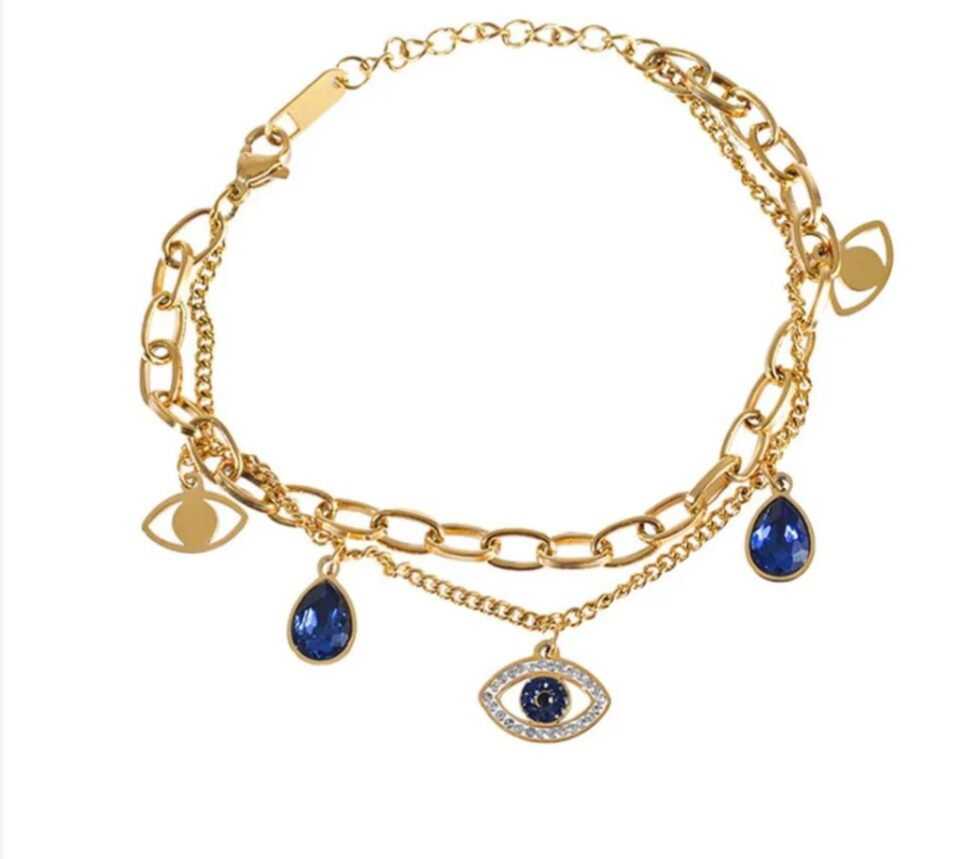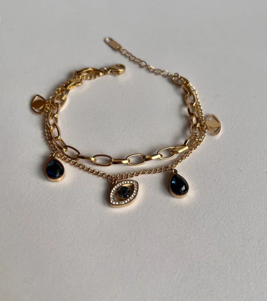 A layered bracelet of radiant gold chains adorned with sapphire-blue charms and the iconic evil eye talisman for a touch of mystery and protection. It effortlessly blends style with symbolism, making it an eye-catching piece for every wrist stack. Anti-tarnish and waterproof.