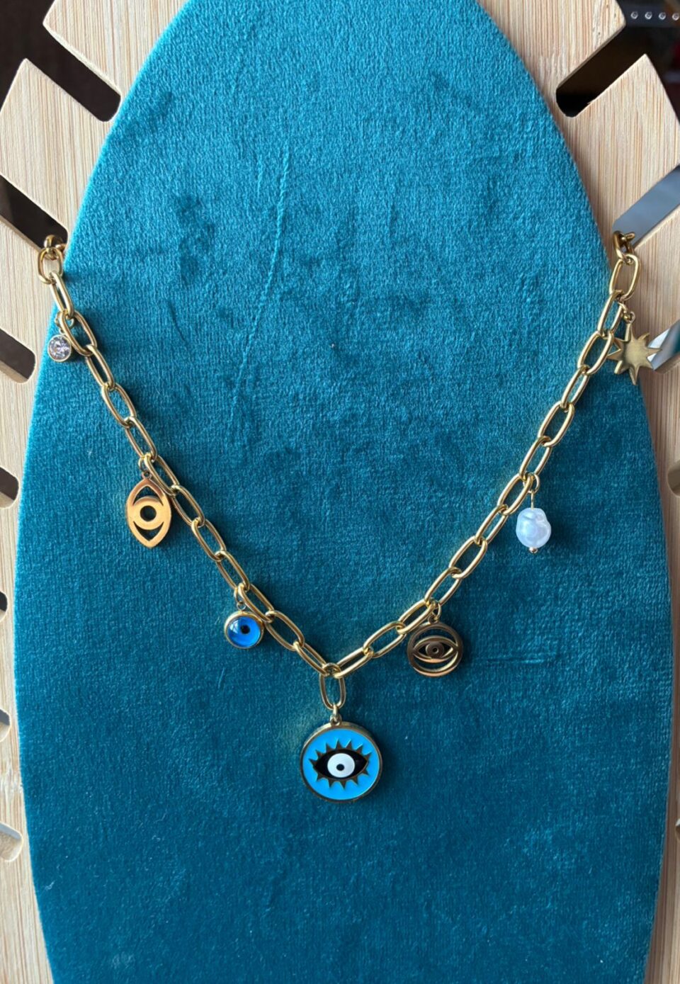 An eye-catching and meaningful piece, this anti-tarnish necklace features a gold-toned link chain with multiple dangling Evil Eye charms for protection and style. The charms vary in size and color, including a large central blue enamel Evil Eye pendant and smaller, subtle accents. A small faux pearl adds a touch of classic elegance to the mystical theme.